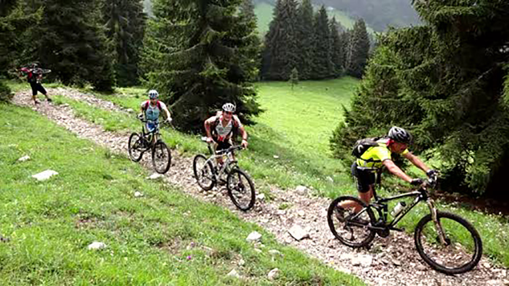 Outcoming the parking, we undertake a little funther the road for Spiazzi di Gromo. Afterreaching the Boario, district, we continue on the road for “Spiazzi”approximately for 1.5 km. having reached a bend (justafter passing on our left a grocery store) we take on the left via Roccolo that, after a few meters, becomes a forest road (CAI 313). We ride immersed in a forest of large conifers to reach a grassy plateau, we then cross the river, we pass alongside the picnics area and go down to the steep and rocky trail (CAI 309). Go passing the first houses of Tezzi Alti, we go left along a trail and cross the road. We will pass behind a church and cross the road again, we take in the old trail in the left that after the last crossing contries in coastline up to GromoSan Marino. Before the bridge over theSerio, river, turn left and ride on the bike path Alta Val Seriana that leads us to our starting point of Gromo