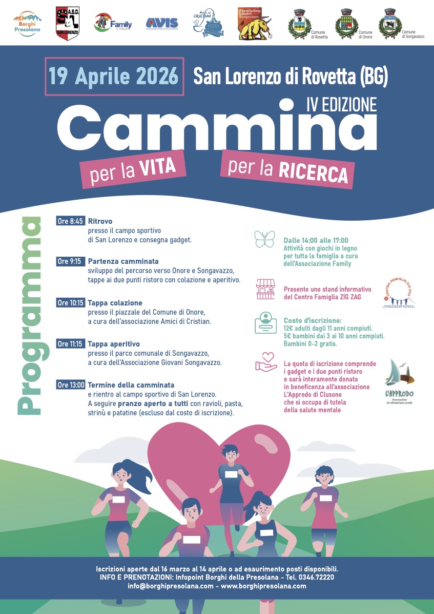I Borghi della Presolana, in collaborazione con ASD San Lorenzo, organizzano la quarta edizione della camminata benefica tra i comuni di Songavazzo, Onore e Rovetta che si terrà domenica 19 aprile.