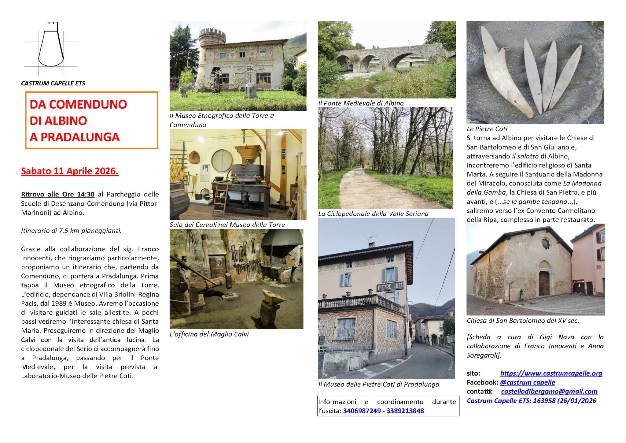 Sabato 11 aprile 2026 l’associazione Castrum Capelle ETS propone una camminata guidata di 7,5 km pianeggianti che, partendo da Comenduno, condurrà fino a Pradalunga.