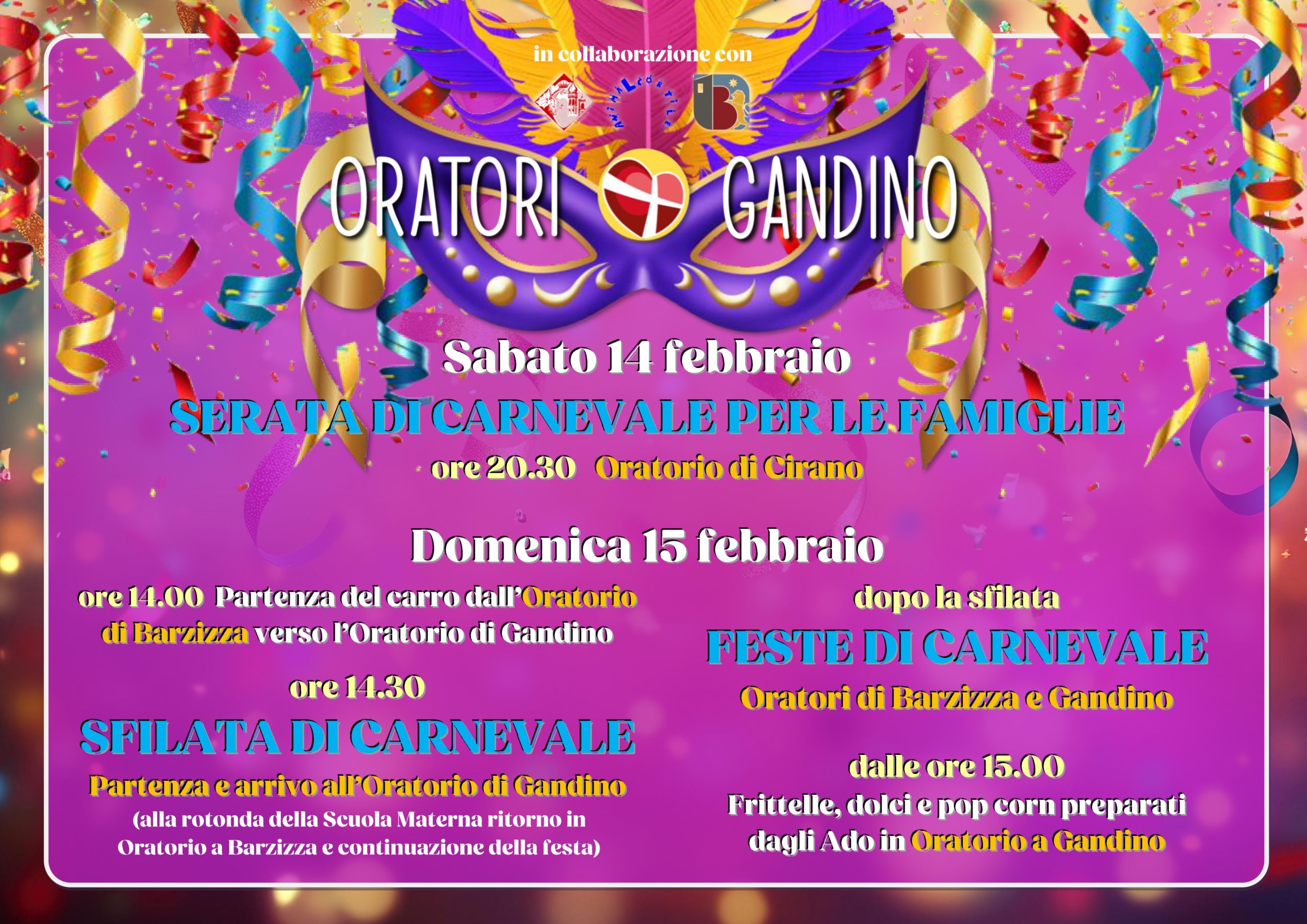 La festa avrà inizio sabato 14 febbraio presso l’oratorio di Cirano, dove, a partire dalle ore 20.30, si terrà una serata speciale dedicata alle famiglie, da vivere insieme tra musica, colori e allegria.