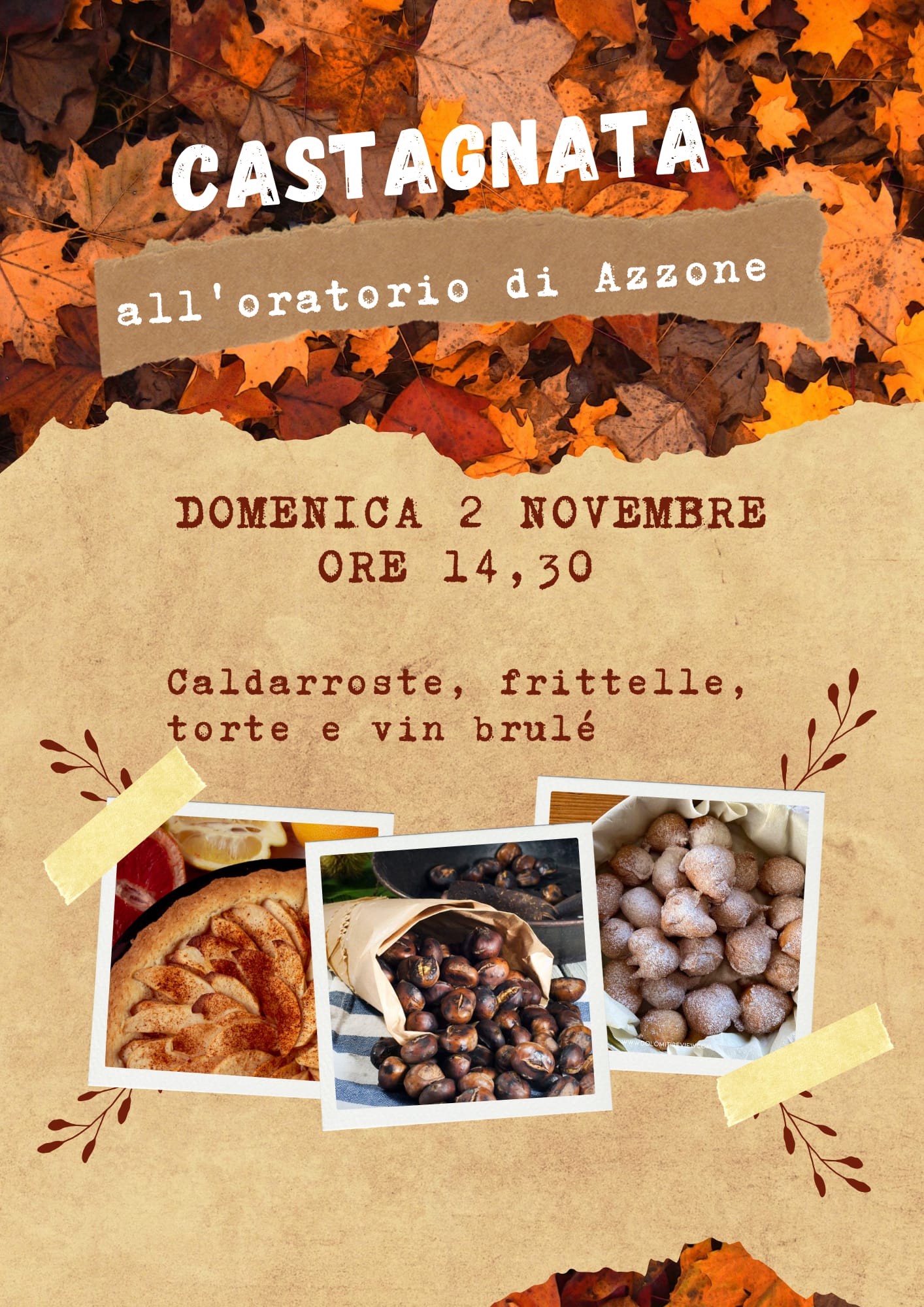 Domenica 2 Novembre l’oratorio di Azzone organizza una castagnata in compagnia, a partire dalle 14.30. Caldarroste, frittelle, torte e Vin Brulè presso l’oratorio, convivialità e divertimento assicurati. L’evento si terrà anche in caso di maltempo.