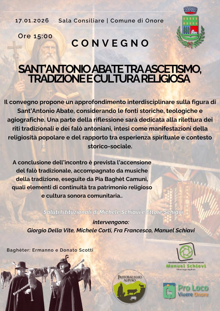 L’incontro è previsto sabato 17 gennaio alle 15:00 presso la sala consiliare del Comune di Onore e propone un approfondimento interdisciplinare sulla figura di Sant’Antonio Abate, considerando le fonti storiche, teologiche e agiografiche. Una parte della riflessione sarà dedicata alla rilettura dei riti tradizionali e dei falò antoniani, intesi come manifestazioni della