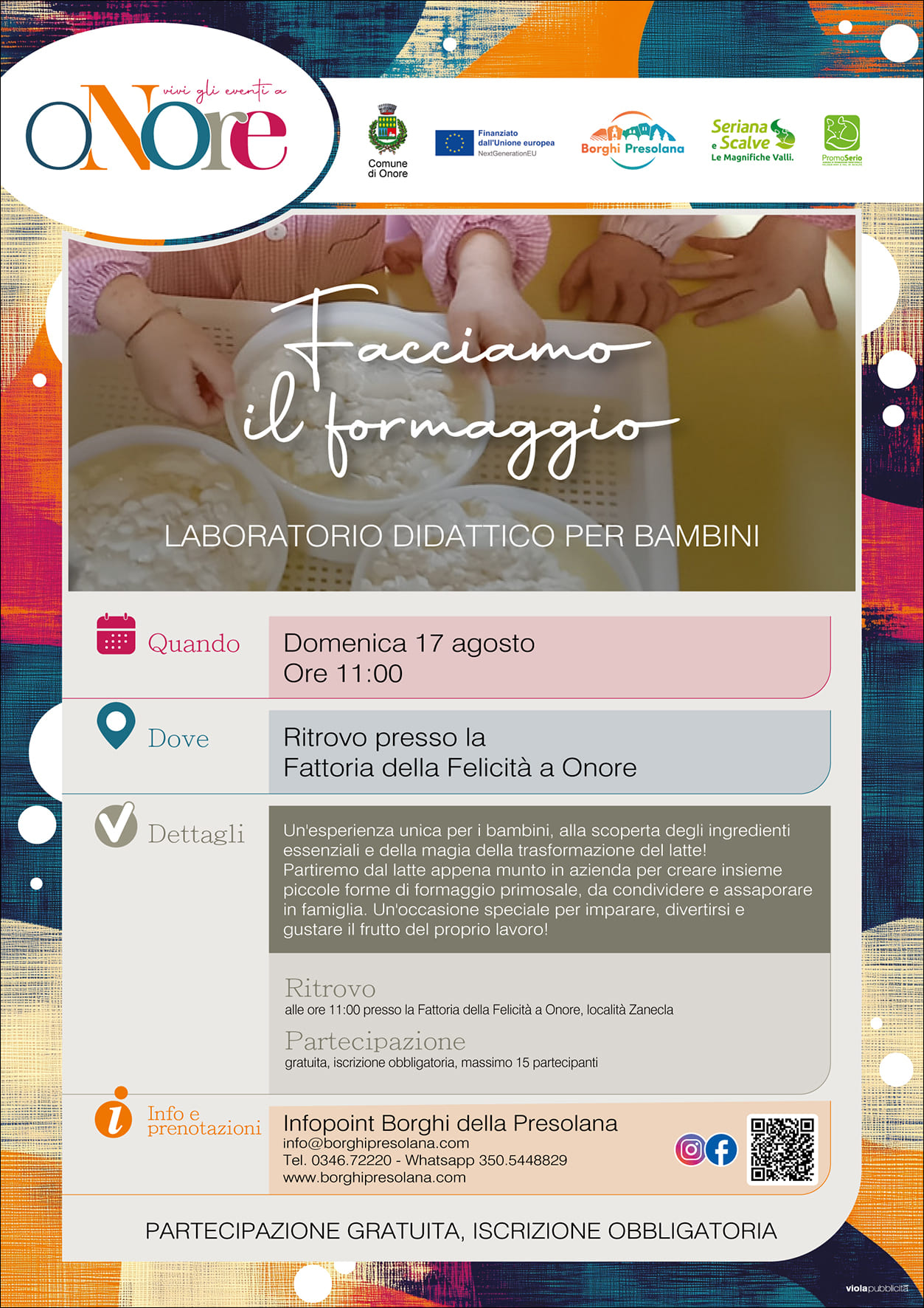 Un’esperienza unica per i bambini, alla scoperta degli ingredienti essenziali e della magia della trasformazione del latte! Partiremo dal latte appena munto in azienda per creare insieme piccole forme di formaggio primosale, da condividere e assaporare in famiglia. Un’occasione speciale per imparare, divertirsi e gustare il frutto del proprio lavoro!