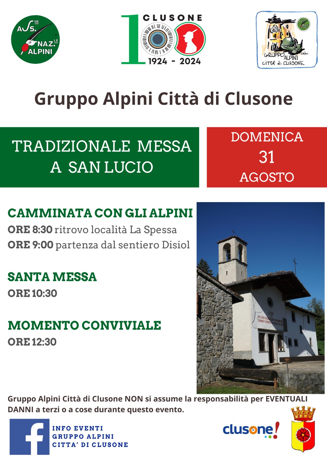 Domenica 31 agosto 2025 il Gruppo Alpini Città di Clusone organizza una giornata da trascorrere in compagnia a San Lucio.