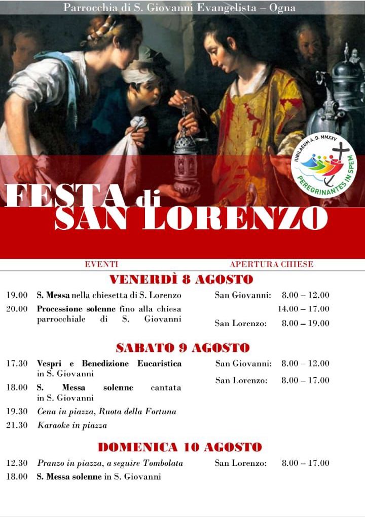 La Festa di San Lorenzo propone, per il sabato, una gustosa cena in piazza e ruota della fortuna; a seguire karaoke in piazza. Per la domenica, pranzo in piazza e a seguire tombolata piazza di Ogna.
