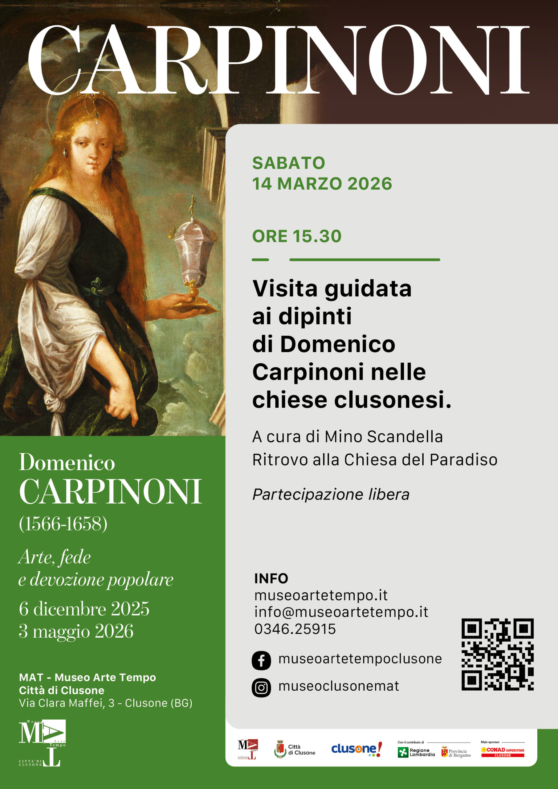 In occasione della mostra Domenico Carpinoni. Arte, fede e devozione popolare, allestita al MAT Museo Arte Tempo di Clusone il Comune di Clusone propone una serie di incontri di approfondimento.