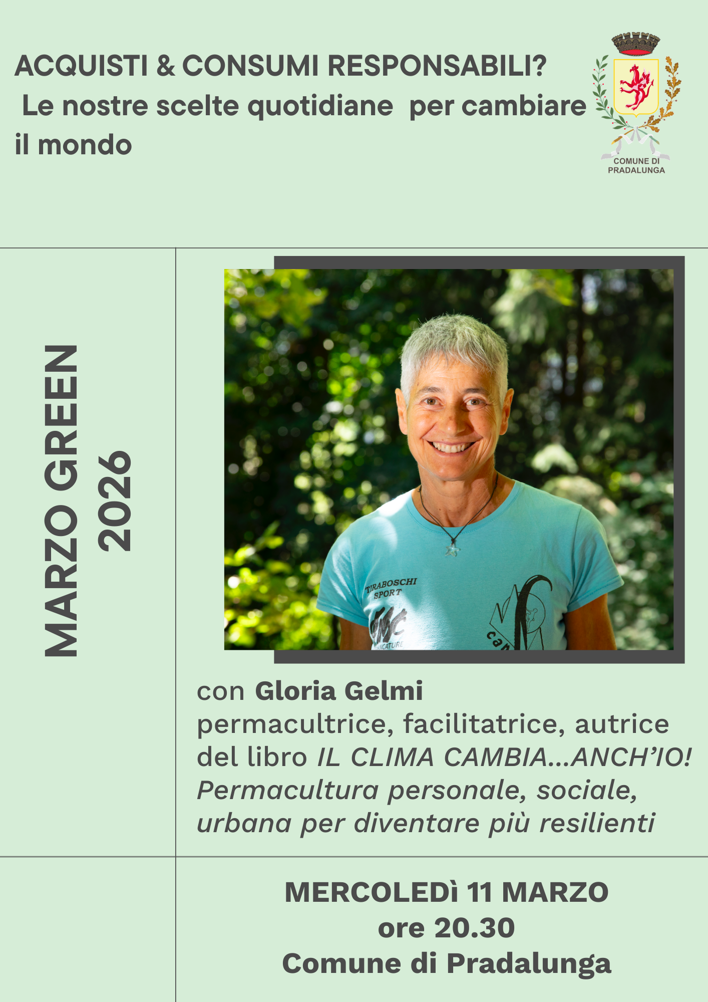 All’interno del ciclo di incontri “Marzo Green”, è in programma per mercoledì 11 marzo alle ore 20.30 presso il Comune di Pradalunga l’appuntamento “Acquisti & Consumi Responsabili? Le nostre scelte quotidiane per cambiare il mondo”, una serata di approfondimento dedicata ai temi della sostenibilità e della responsabilità individuale.