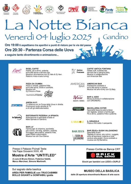 Il Vizio offre music & drinks in collaborazione con Oronero, mentre il Bar Zeus sul sagrato della Basilica propone le specialità di Sushi Valgandino, tagliata di carne, pà e strinù, nuggests, olive all’ascolana, polenta e zola, verdure alla griglia, ma anche zona cocktails e musica con dj Danielino.