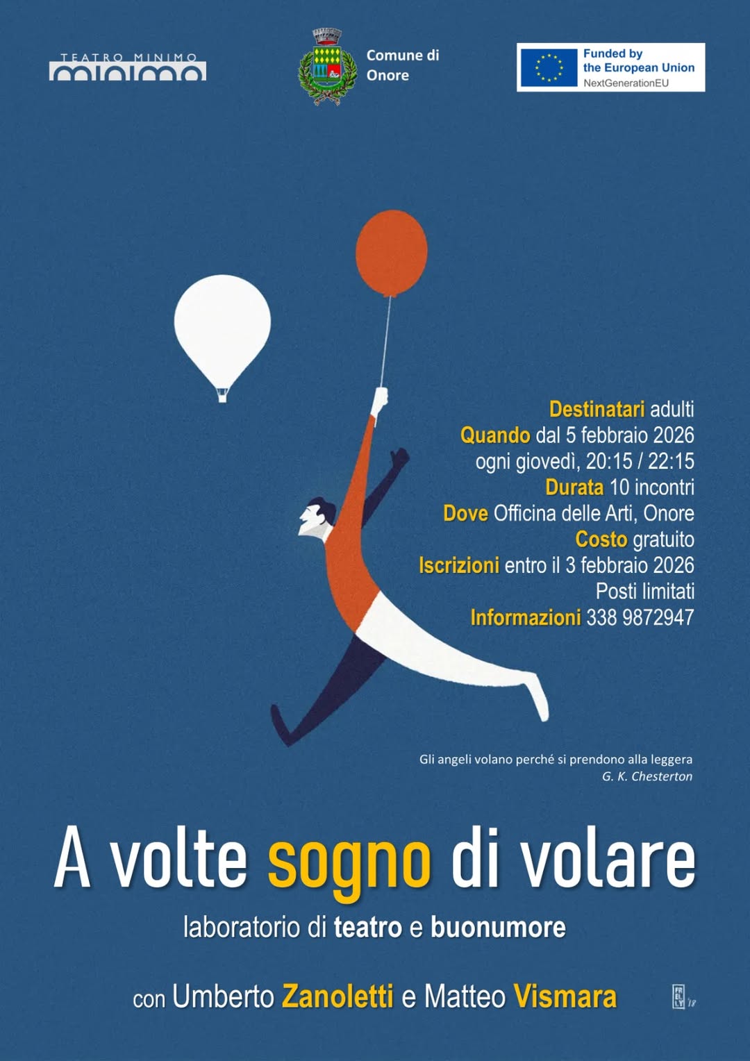 Il Comune di Onore, in collaborazione con Teatro Minimo, organizza “A volte sogno di volare”: un laboratorio di teatro e buonumore per adulti.