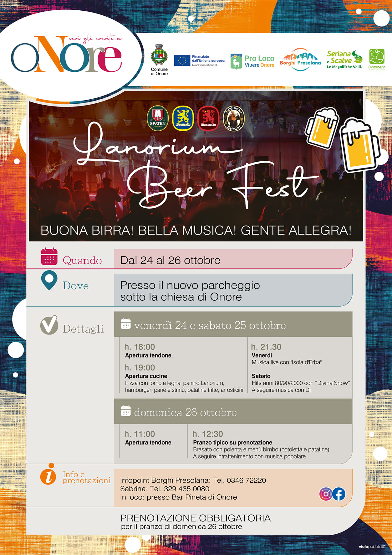 Da venerdì 24 a domenica 26 ottobre a Onore è prevista la seconda edizione di Lanorium Beer Fest presso il nuovo parcheggio sotto la Chiesa Parrocchiale di Onore che per l’occasione si trasformerà nella location di una tipica festa bavarese.
