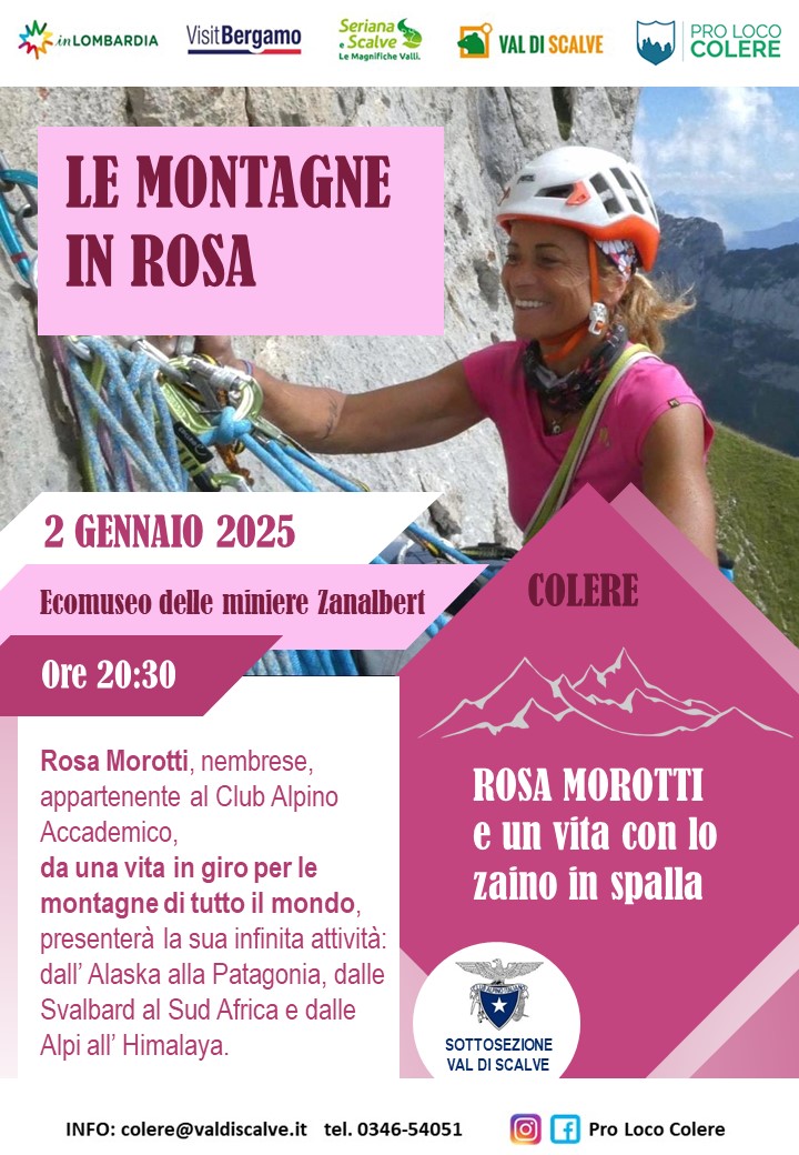 Venerdì 2 Gennaio, la pro Loco Colere, in collaborazione con la sottosezione Cai Valle di Scalve, organizza una serata a tema montagna e alpinismo, con ospite Rosa Morotti, alpinista nembrese appartenente al Club alpino accademico.