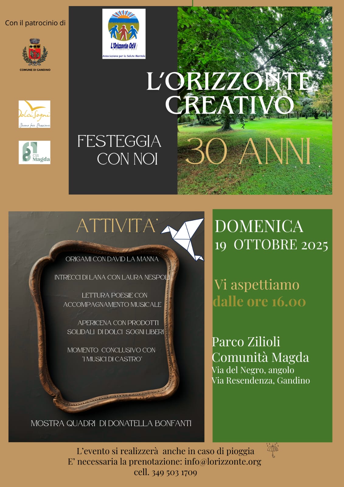 Domenica 19 ottobre dalle ore 16.00 a Gandino, presso il parco Zilioli – Comunità Magda, è in programma “L’orizzonte creativo”, un appuntamento per celebrare insieme i 30 anni di L’Orizzonte ODV, associazione per la salute mentale.
