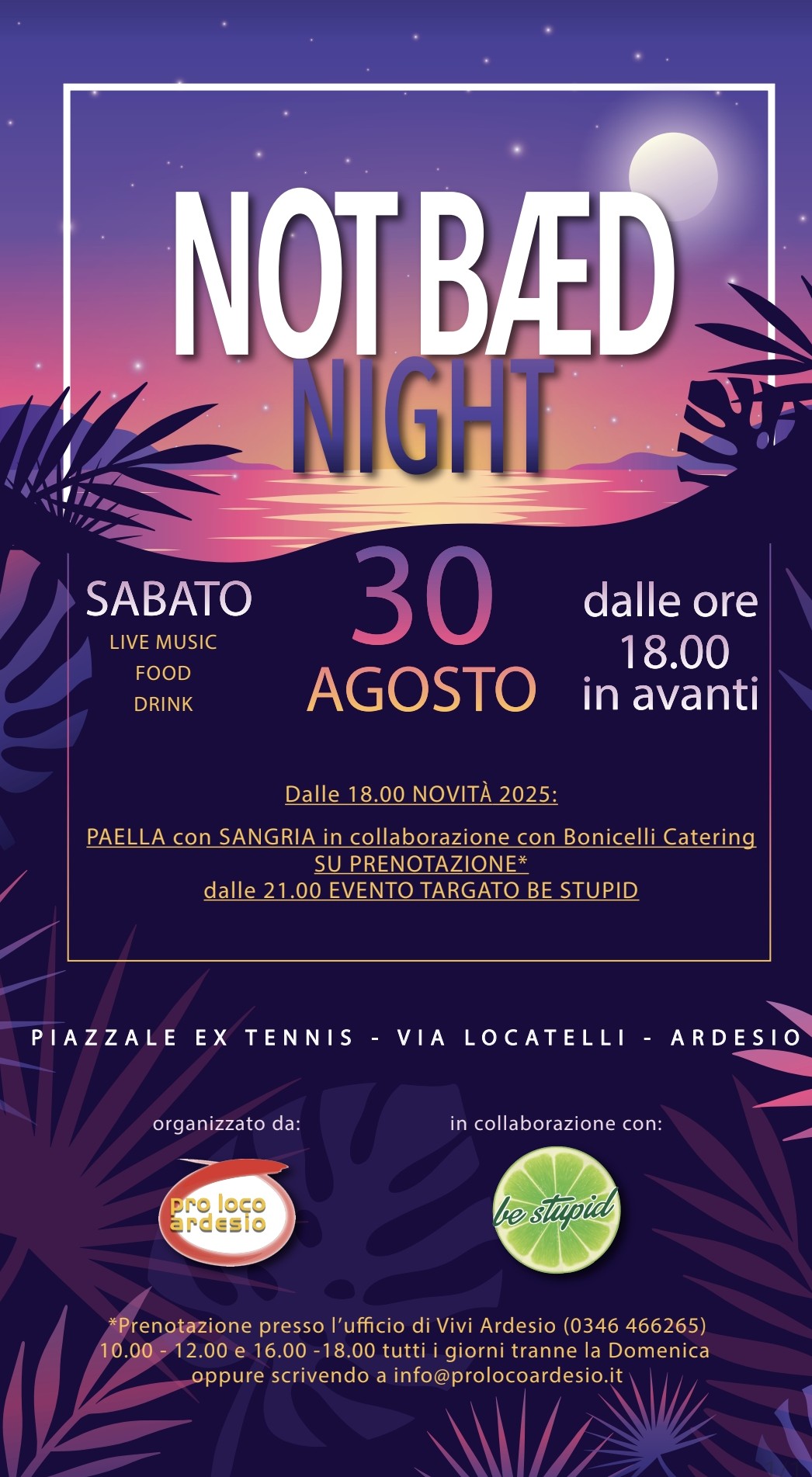 Musica dall’aperitivo alla notte, divertimento, cocktail e poi paella e sangria, e una serata targata “Be Stupid”: la seconda edizione di “Not band Night” l’evento della Pro Loco Ardesio, dopo il successo dello scorso anno, torna ad Ardesio sabato 30 agosto, con una nuova location, il parcheggio ex tennis (in via Locatelli) e alcune novità.