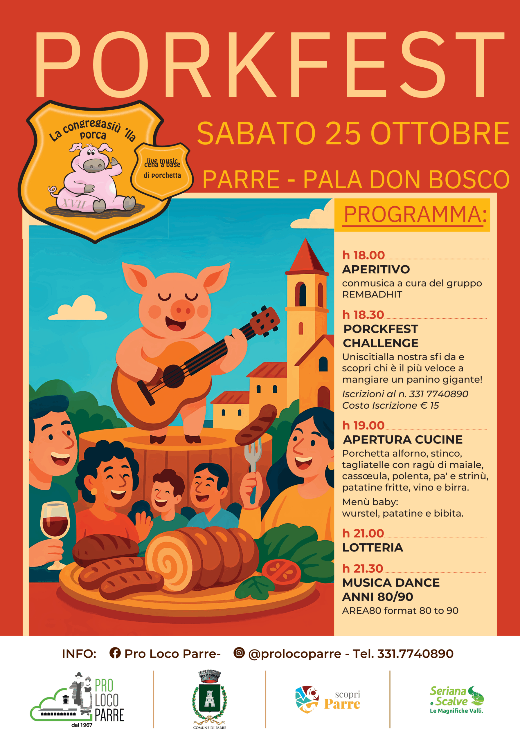 Sabato 25 ottobre torna a Parre, presso il Pala Don Bosco, l’evento più gustoso e divertente dell’autunno: la PORKFEST! Una serata all’insegna della buona cucina tradizionale, della musica live e del divertimento per grandi e piccoli.