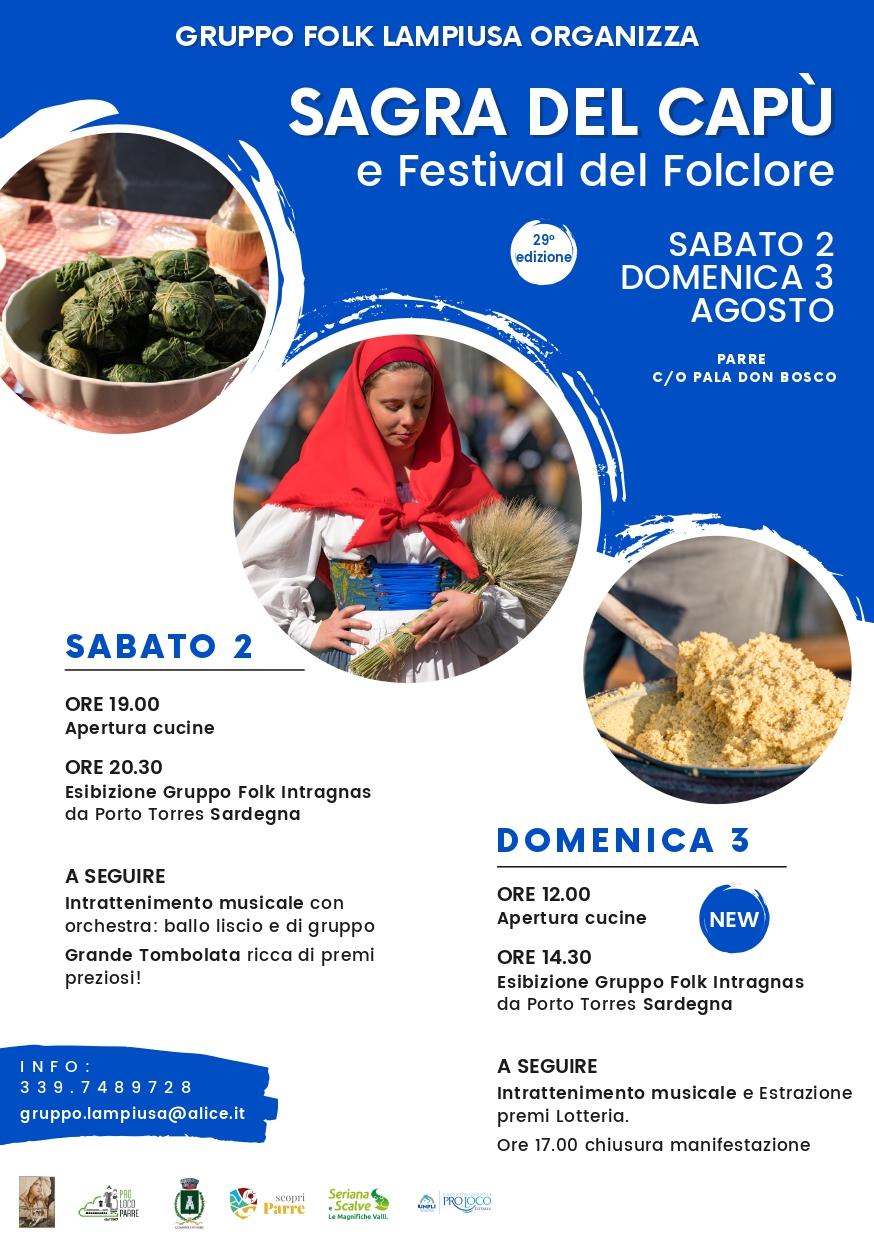 Il Gruppo Folcloristico Lampiusa organizza la 29^ edizione della Sagra del Capù e il Festival del Folclore presso il Pala Don Bosco dell’Oratorio di Parre.