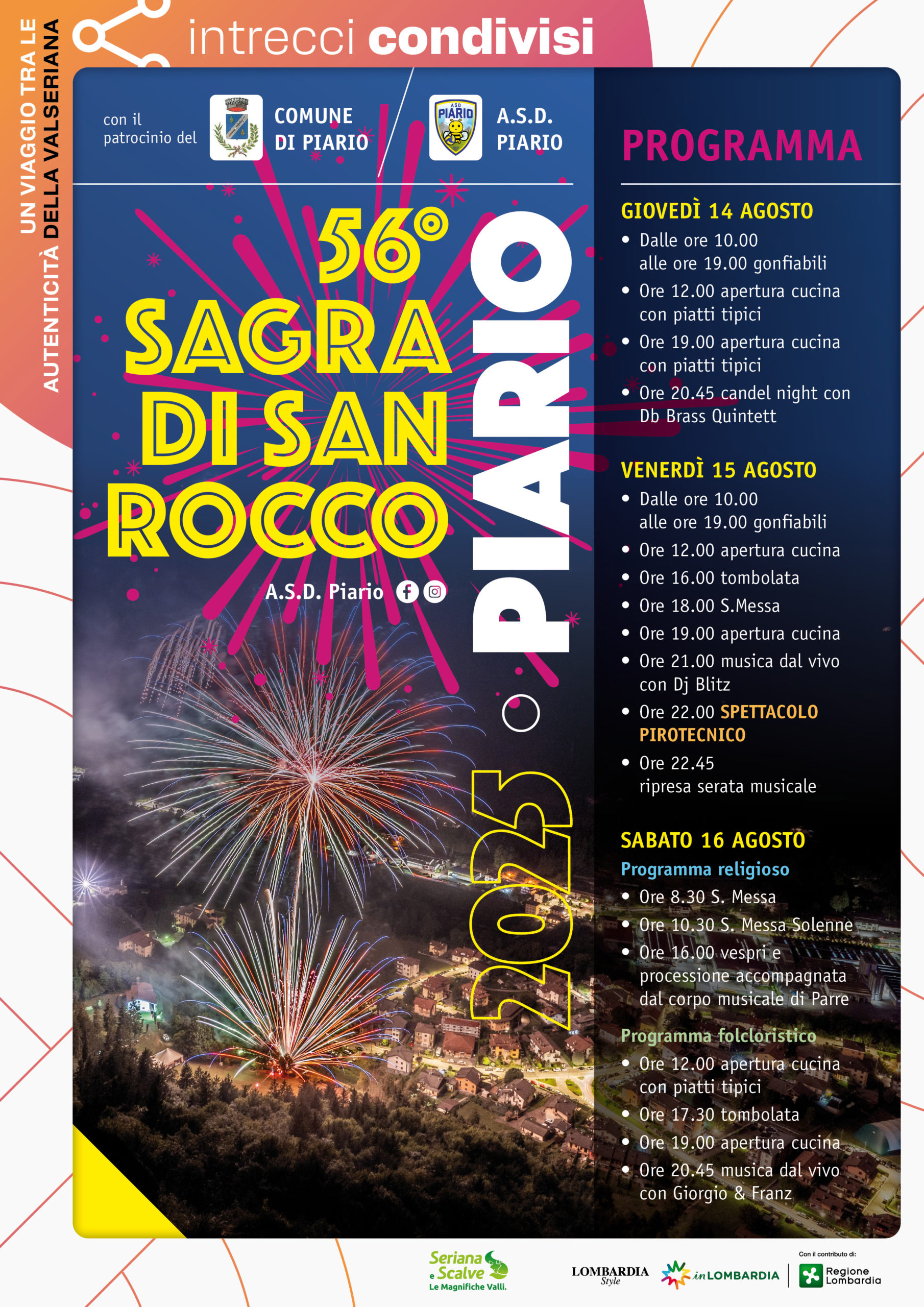 Torna a Piario la tradizionale Sagra di San Rocco, che nel 2025 giunge alla sua 56° edizione e si inserisce nel palinsesto di eventi di “Intrecci condivisi“: 3 giornate ricche di buon cibo, musica e divertimento in compagnia.