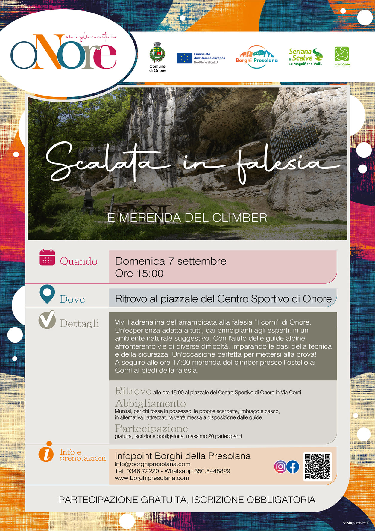 Vivi l’adrenalina dell’arrampicata alla falesia “I corni” di Onore. Un’esperienza adatta a tutti, dai principianti agli esperti, in un ambiente naturale suggestivo. Con l’aiuto delle guide alpine, affronteremo vie di diverse difficoltà, imparando le basi della tecnica e della sicurezza. Un’occasione perfetta per mettersi alla prova! A seguire alle ore 17.00 merenda del climber presso l’ostello ai Corni ai piedi della falesia.
