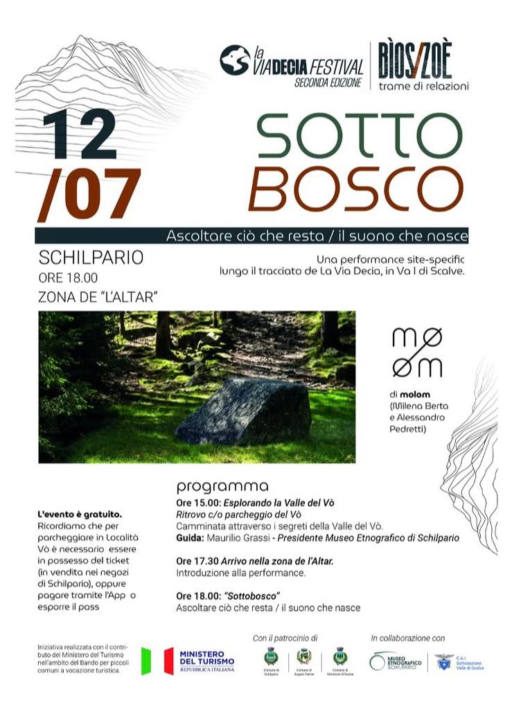 Alle ore 18:00, “Sottobosco”, una performance site-specific di Molom ( Milena Berta e Alessandro Pedretti ), nella zona de “L’altar ( sulla sponda sinistra in risalita del torrente Vo) : suoni raccolti, oggetti trovati, memorie vegetali diventano natura viva. E possibile assistere allo spettacolo anche senza aver partecipato alla camminata.