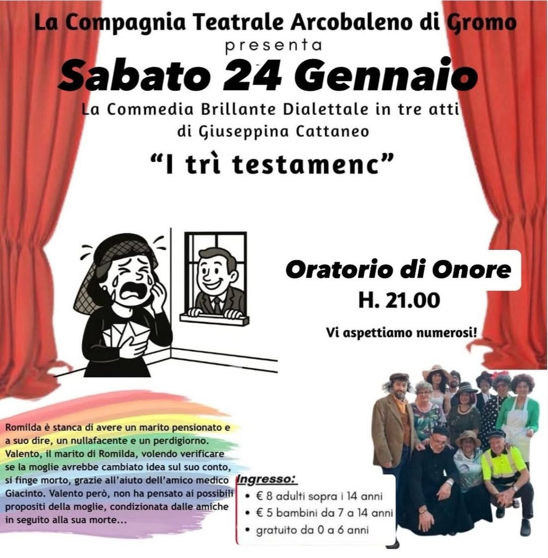 Sabato 24 gennaio la compagnia teatrale Arcobaleno di Gromo presenta la commedia dialettale: “I trì testamenc” presso l’oratorio di Onore alle ore 21:00.