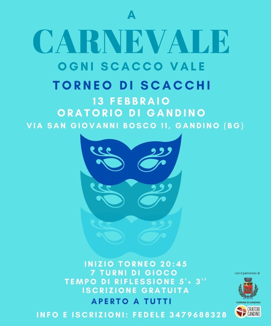 Venerdì 13 febbraio, presso l’oratorio di Gandino, è in programma il “Torneo di Scacchi di Carnevale”.