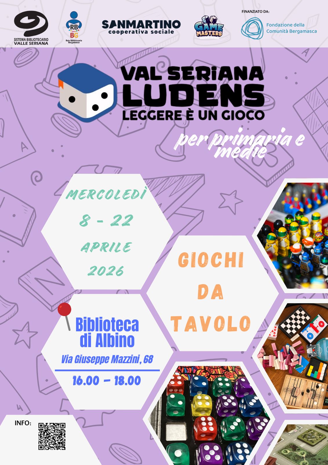 L’8 aprile 2026, dalle 16.00 alle 18.00, la sezione ragazzi al 2° piano della Biblioteca di Albino si trasformerà in uno spazio dedicato al divertimento e alla condivisione: un pomeriggio di giochi da tavolo pensato per i bambini della Primaria e per i ragazzi delle Medie.