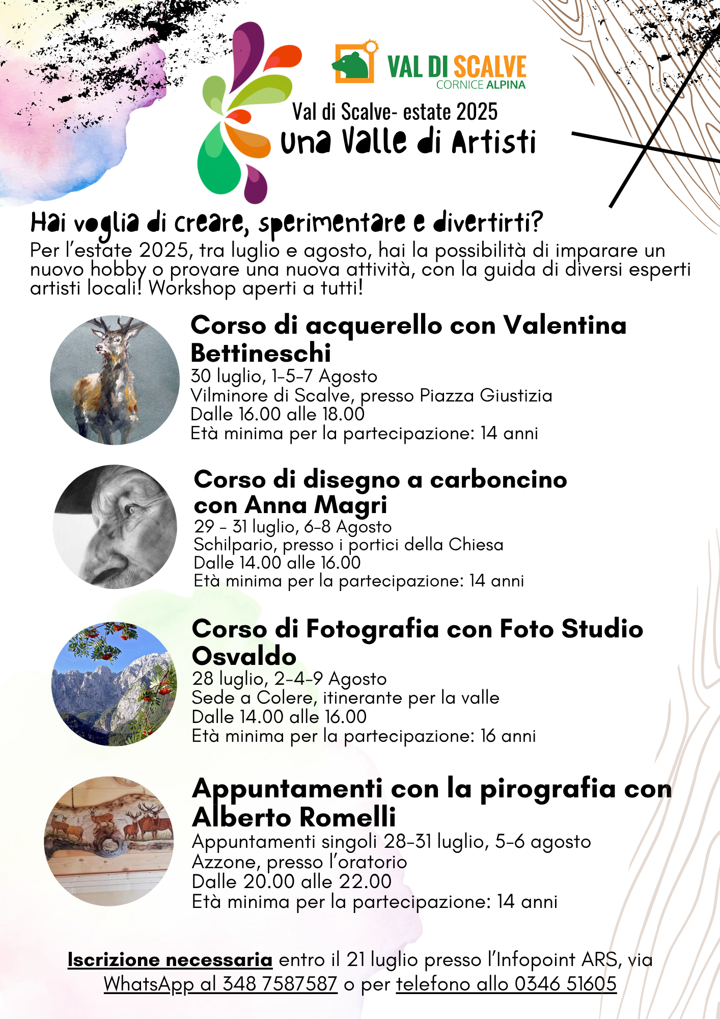 Per l’estate 2025, l’Infopoint ARS propone una serie di workshop artistici diffusi sul territorio della valle, per valorizzare artisti e artigiani locali e avvicinare residenti e turisti alla creatività e alle attività artistiche. I corsi vengono tenuti personalmente da qualificati artisti, professionisti e artigiani locali e sono aperti a ragazzi, adulti, e anziani interessati a mettere alla prova le proprie abilità manuali.