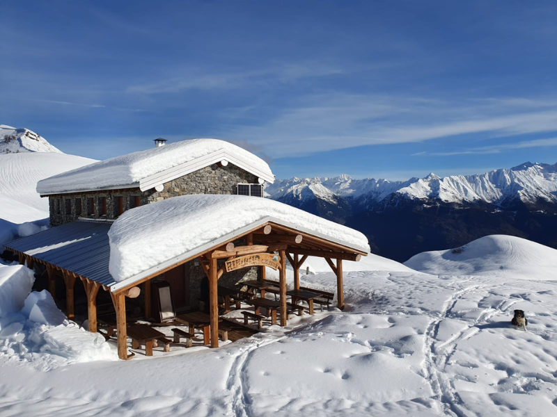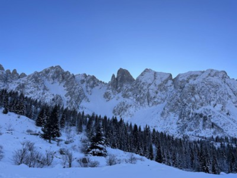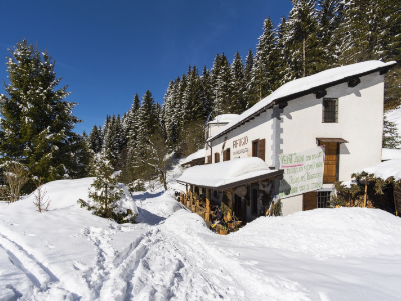 Lasciata l’auto si imbocca la strada sterrata, seguendo la traccia di neve battuta, per raggiungere in circa un oretta di cammino il Rifugio Cimon della Bagozza (1600 m.s.l.m.) passando per la Malga di Cimalbosco.