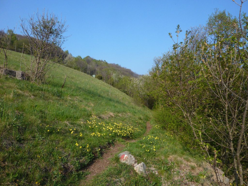 Appena prima della cascina si sale fino a raggiungere un roccolo e si continua su un sentiero pianeggiante che conduce a un agglomerato composto da alcune cascine ben mantenute. Si scende su una comoda mulattiera e, dopo circa 150 metri di discesa, sulla sinistra si trova una deviazione che porta alla Fonte delle Cisterne (807 m).